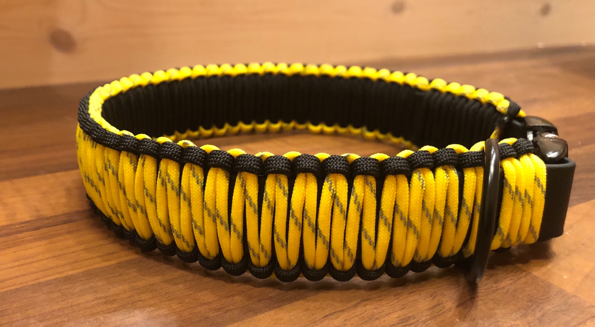 Panta materiaalina on käytetty BioThane nauhaa, johon päälle on punottu paracord narusta kaunis punos. Pannan lukko sekä D-rengas alumiinia.