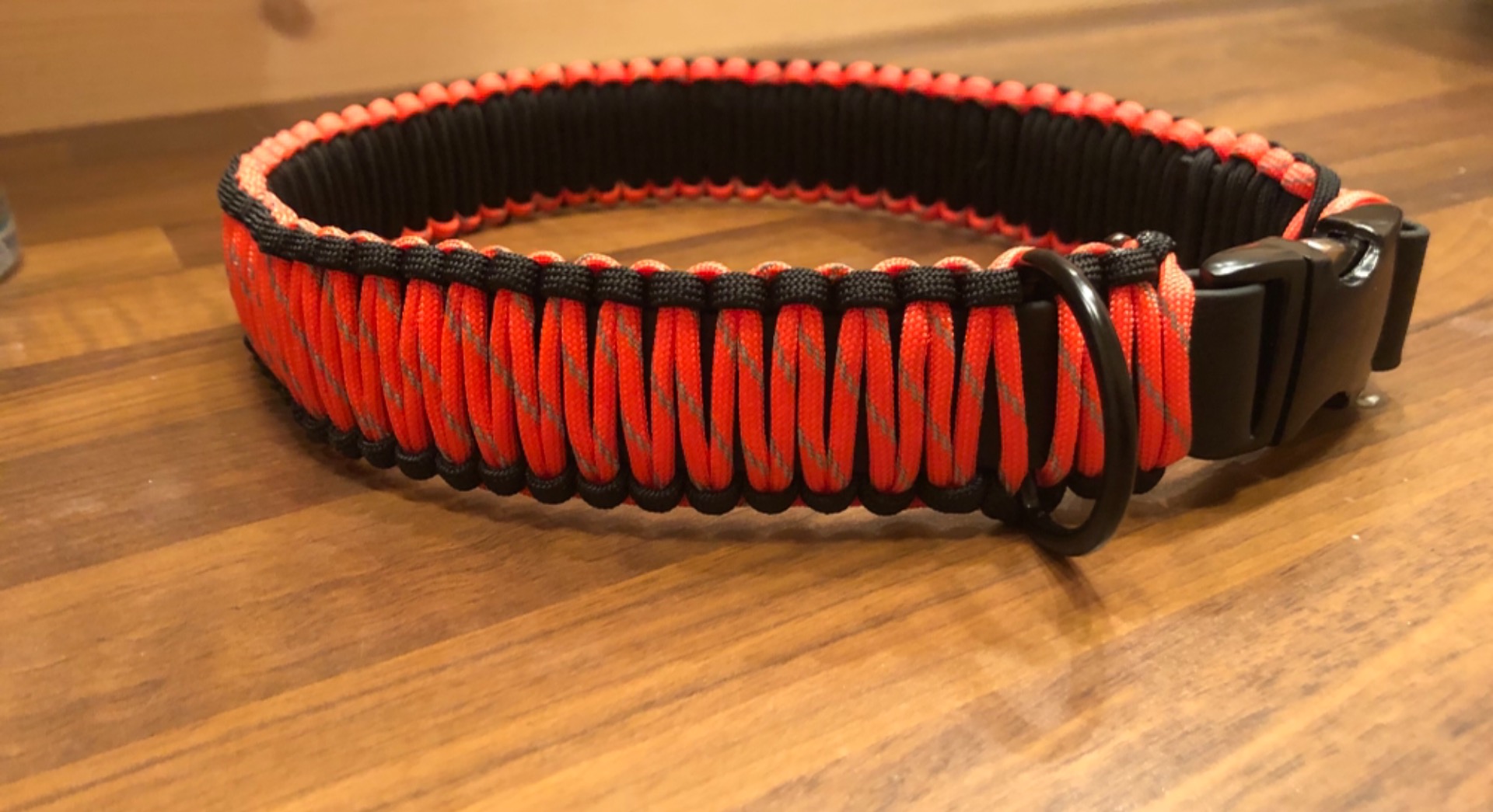 Panta materiaalina on käytetty BioThane nauhaa, johon päälle on punottu paracord narusta kaunis punos. Pannan lukko sekä D-rengas alumiinia.
